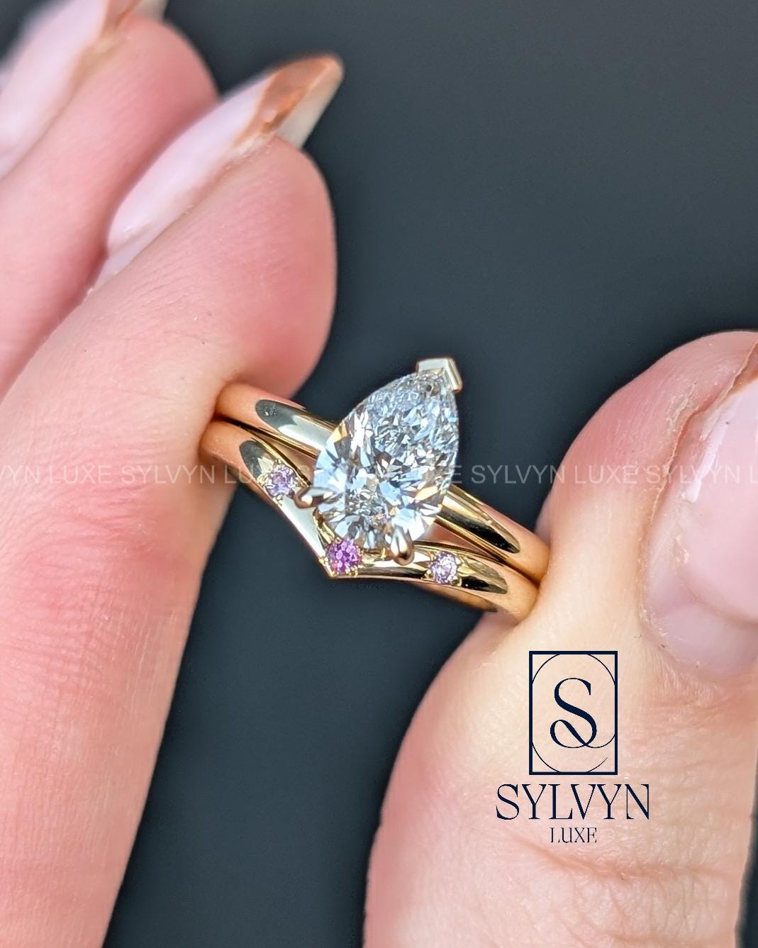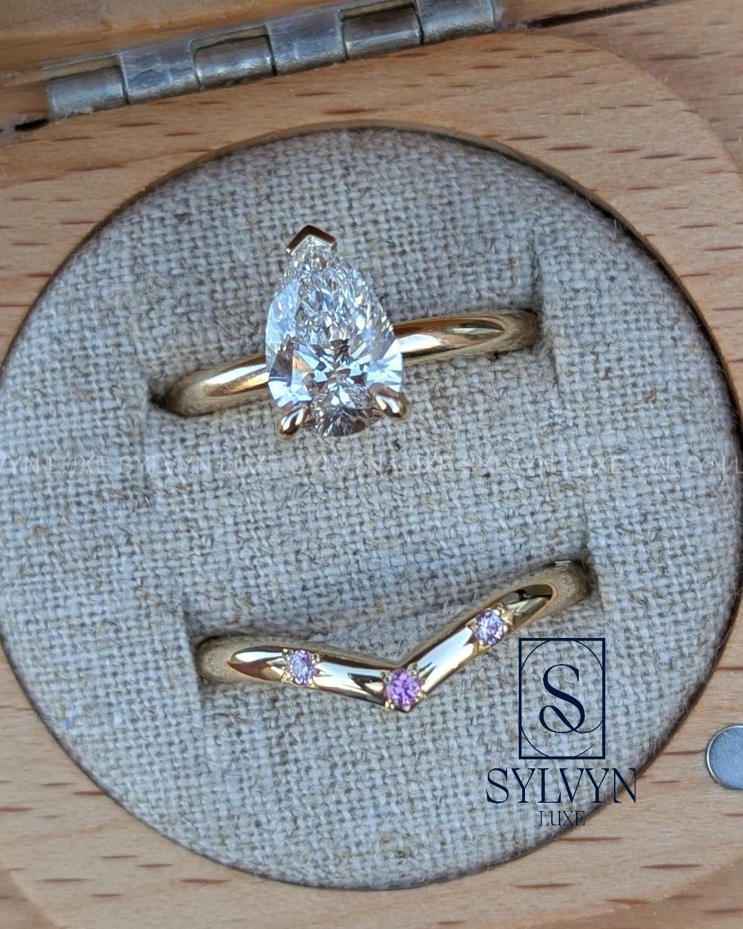 Pear Lab Grown Diamond Engagement Ring with V Shape Pink Sapphire Band, Minimalist Gold Bridal Ring Set