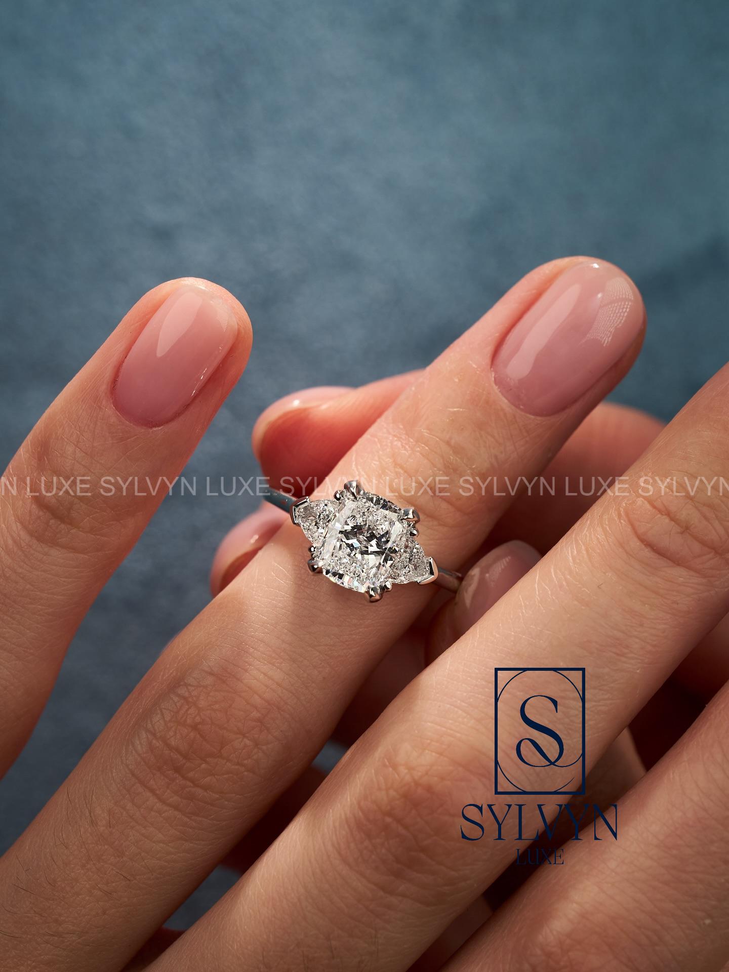 2.4 TCW Cushion Lab Grown Diamond Engagement Ring with Trillion Side Stones, Three Stone Gold Bridal Ring