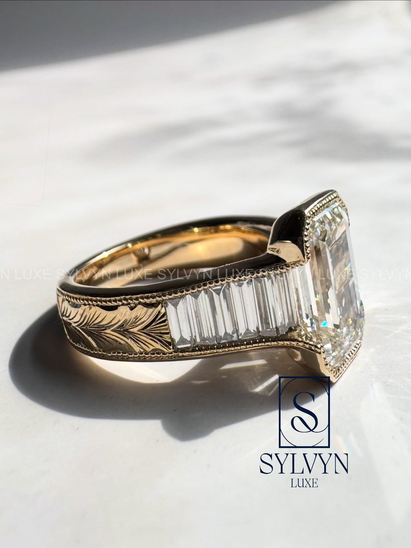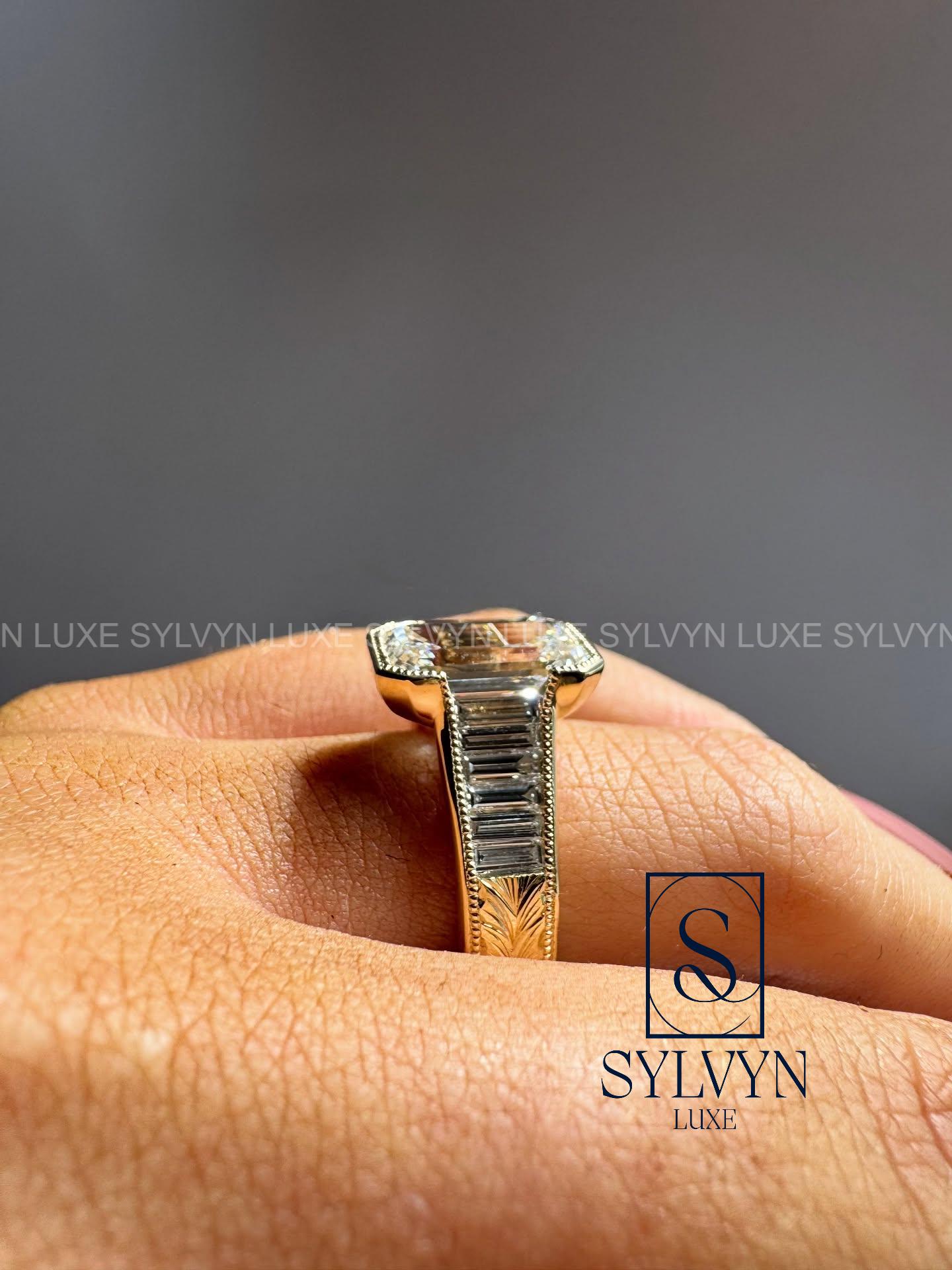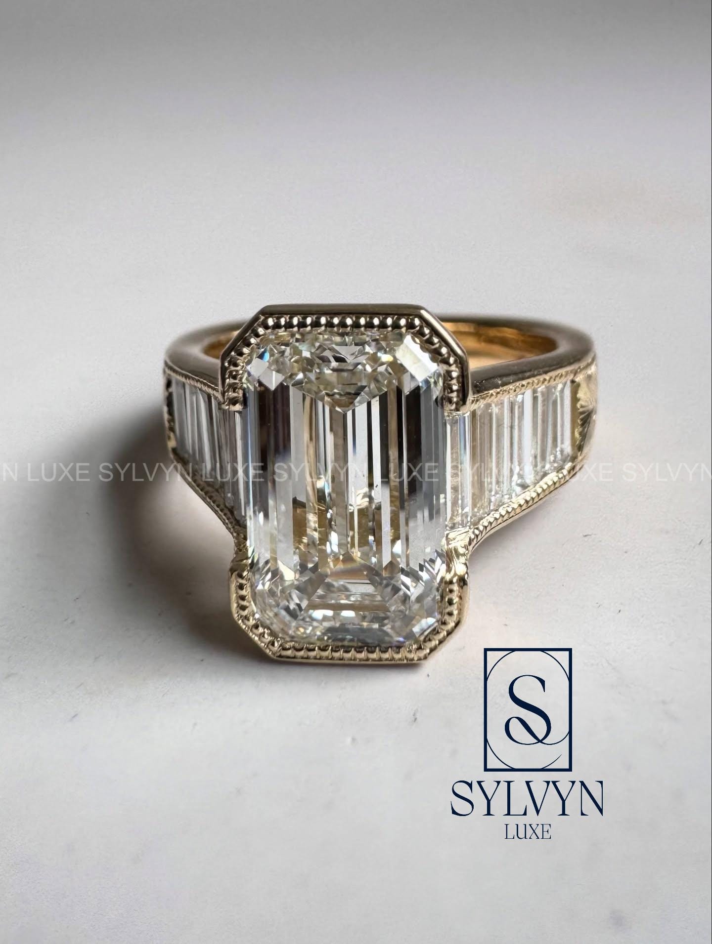 4.4 TCW Emerald Cut Lab Grown Diamond Ring with Baguette Side Stones, Bezel Set Vintage Gold Engagement Ring