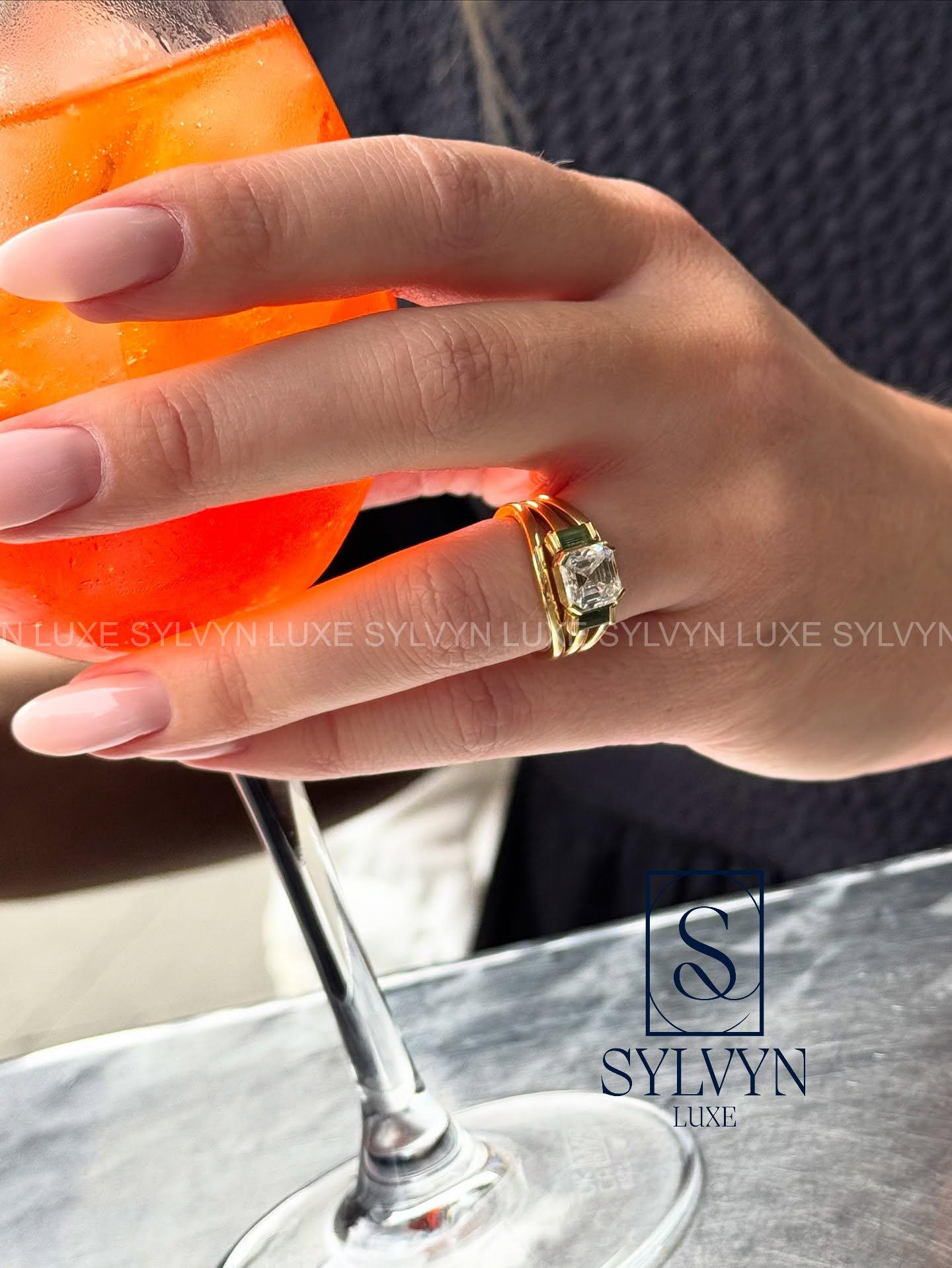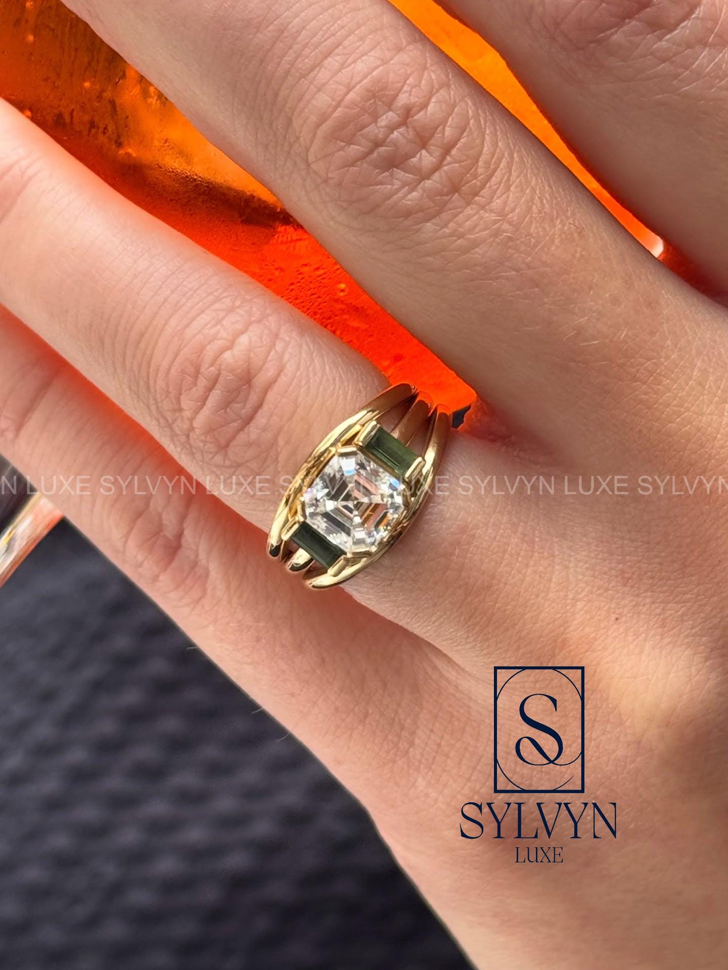 Asscher Cut Lab Grown Diamond Ring Set of 3 with Green Baguette Side Stones, Modern Gold Engagement Ring IGI Certified