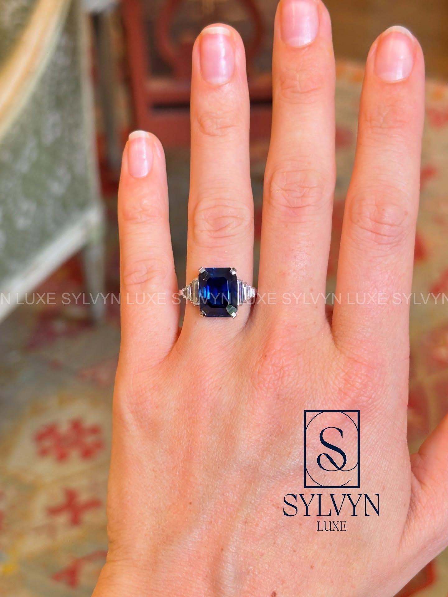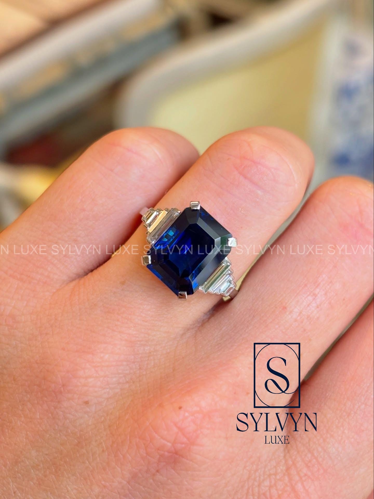 2.9CT IGI Certified Emerald Blue Lab Grown Diamond Ring with Baguette Side Stone, Three Stone Gold Engagement Ring Emerald Gemstone Ring
