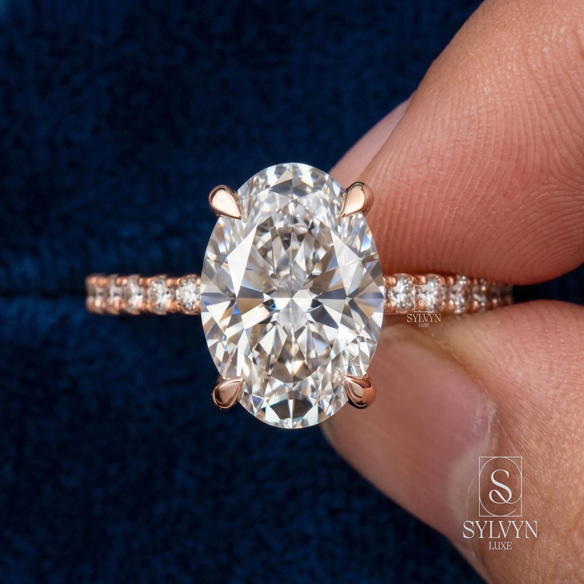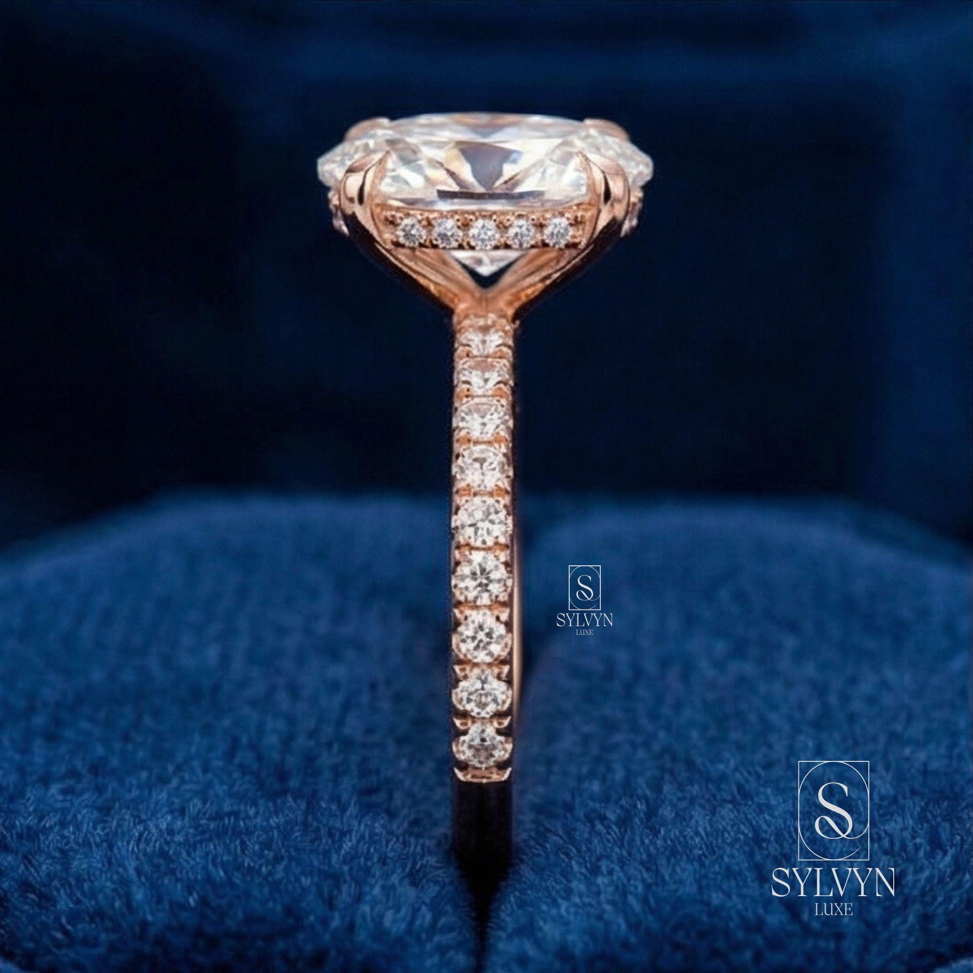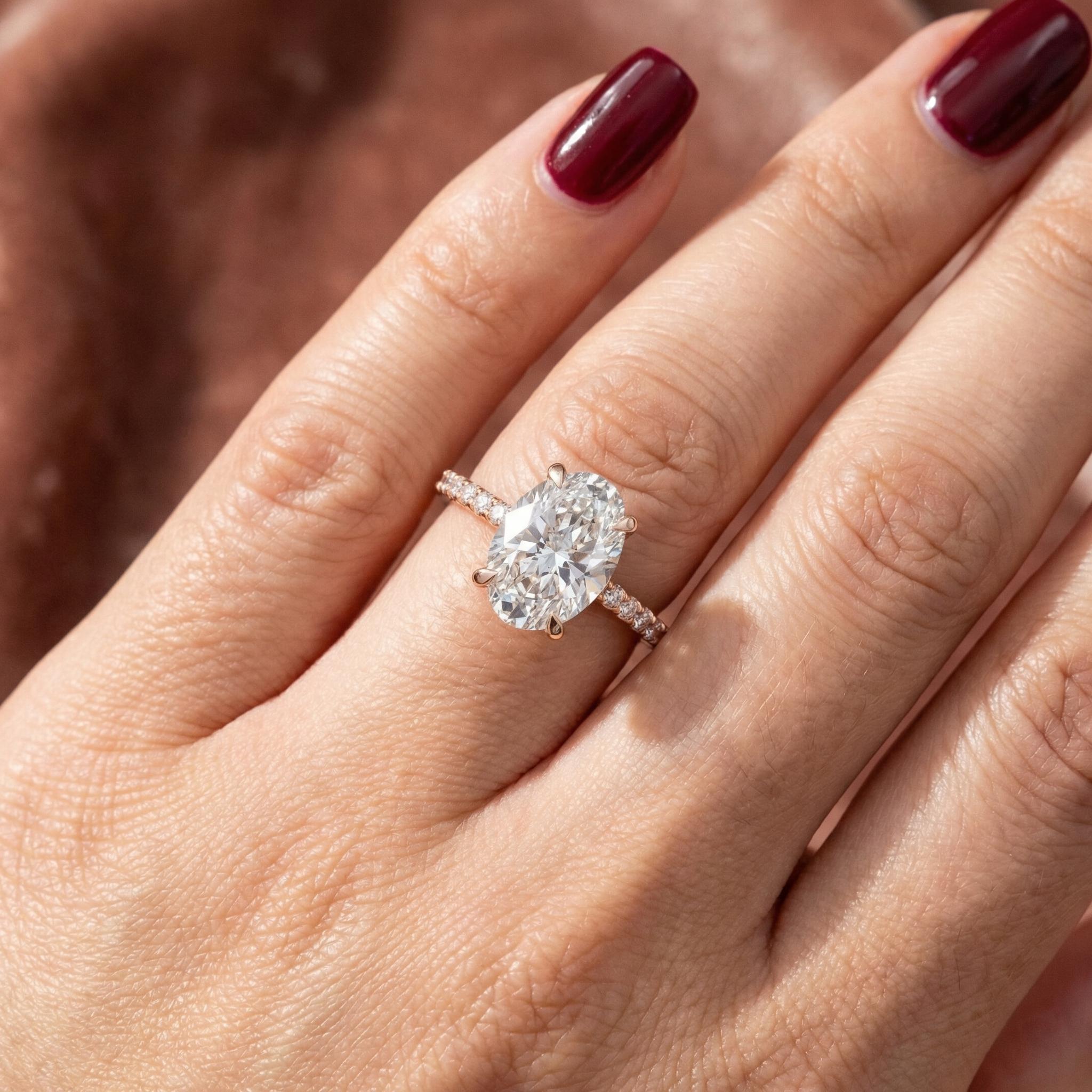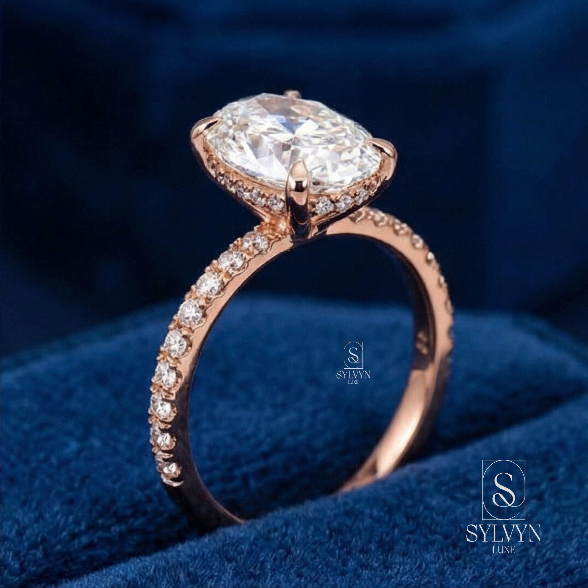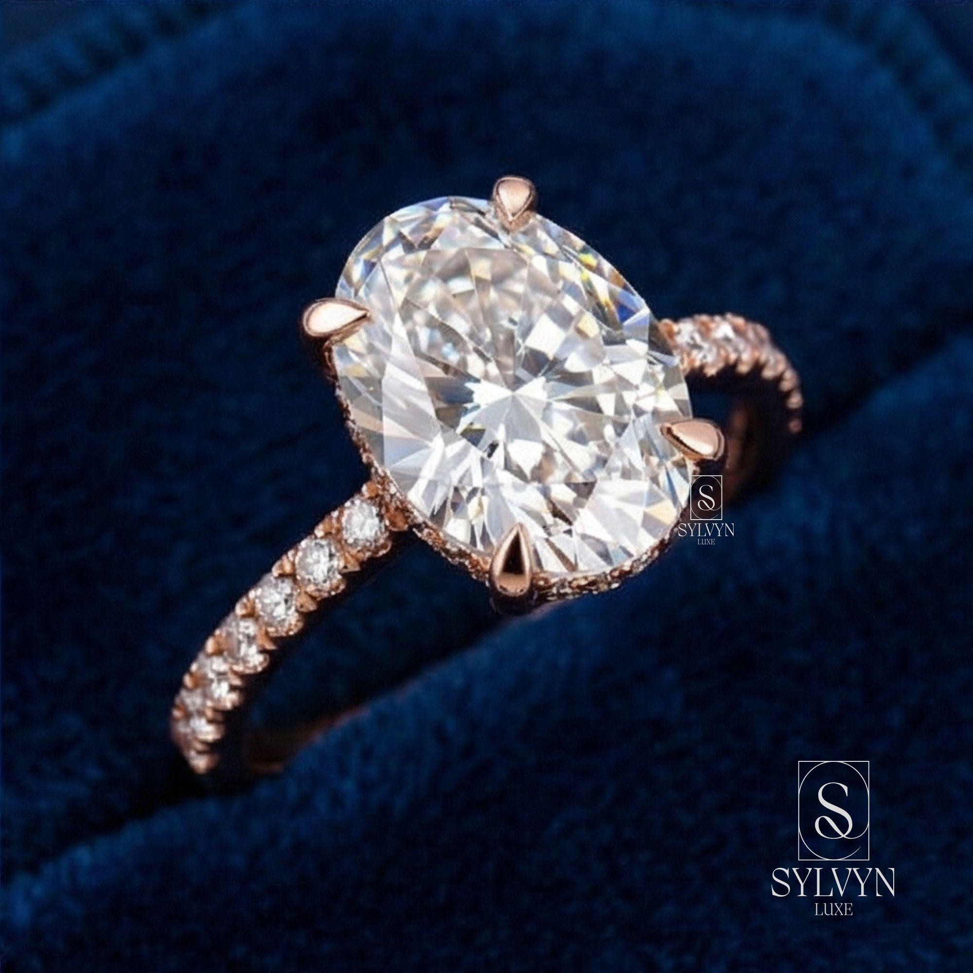Oval Cut Lab Grown Hidden Halo, IGI Certified Diamond Engagement Ring, Pavé Band Solitaire Ring, Gift For Her, Valentine's Day Gift