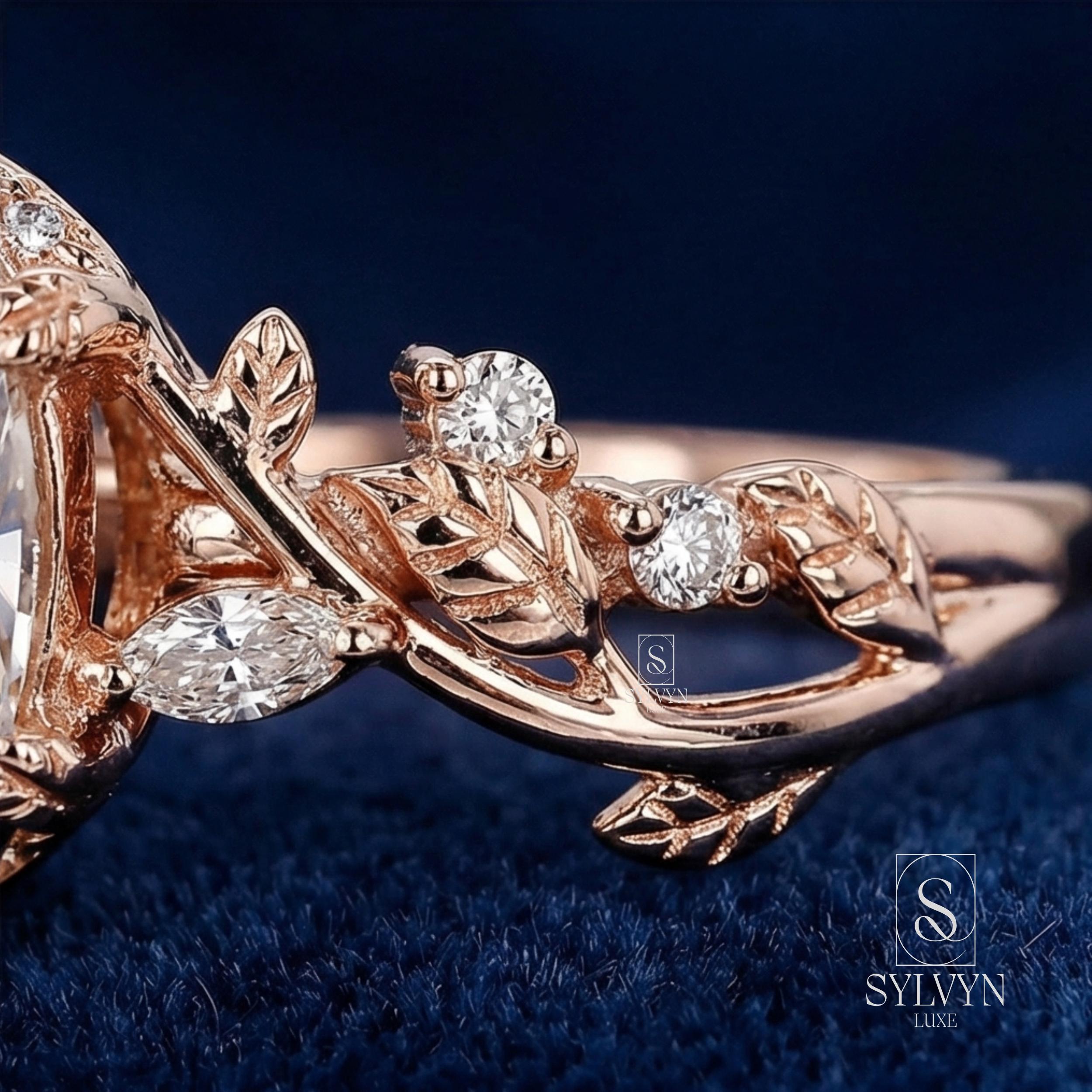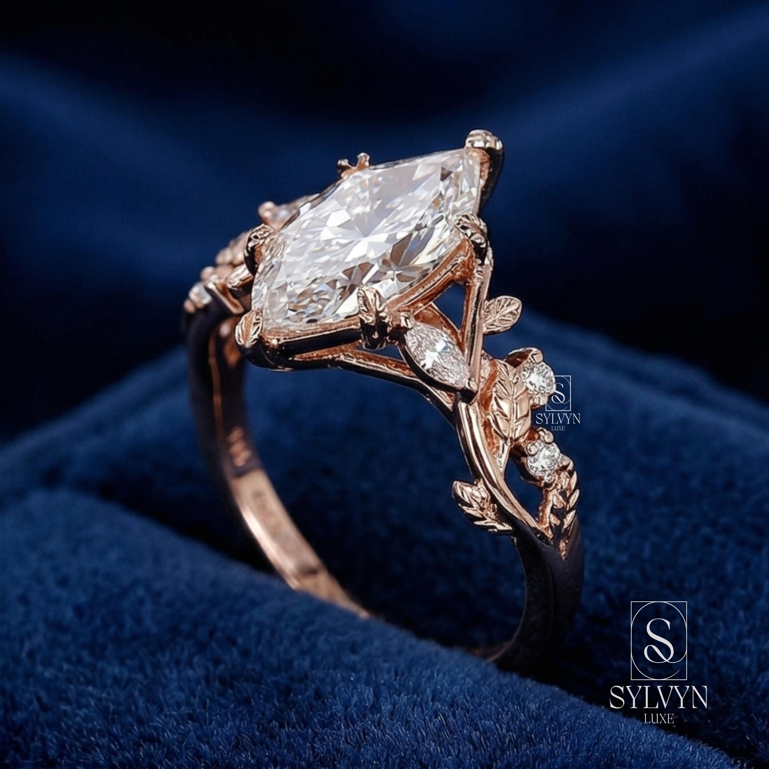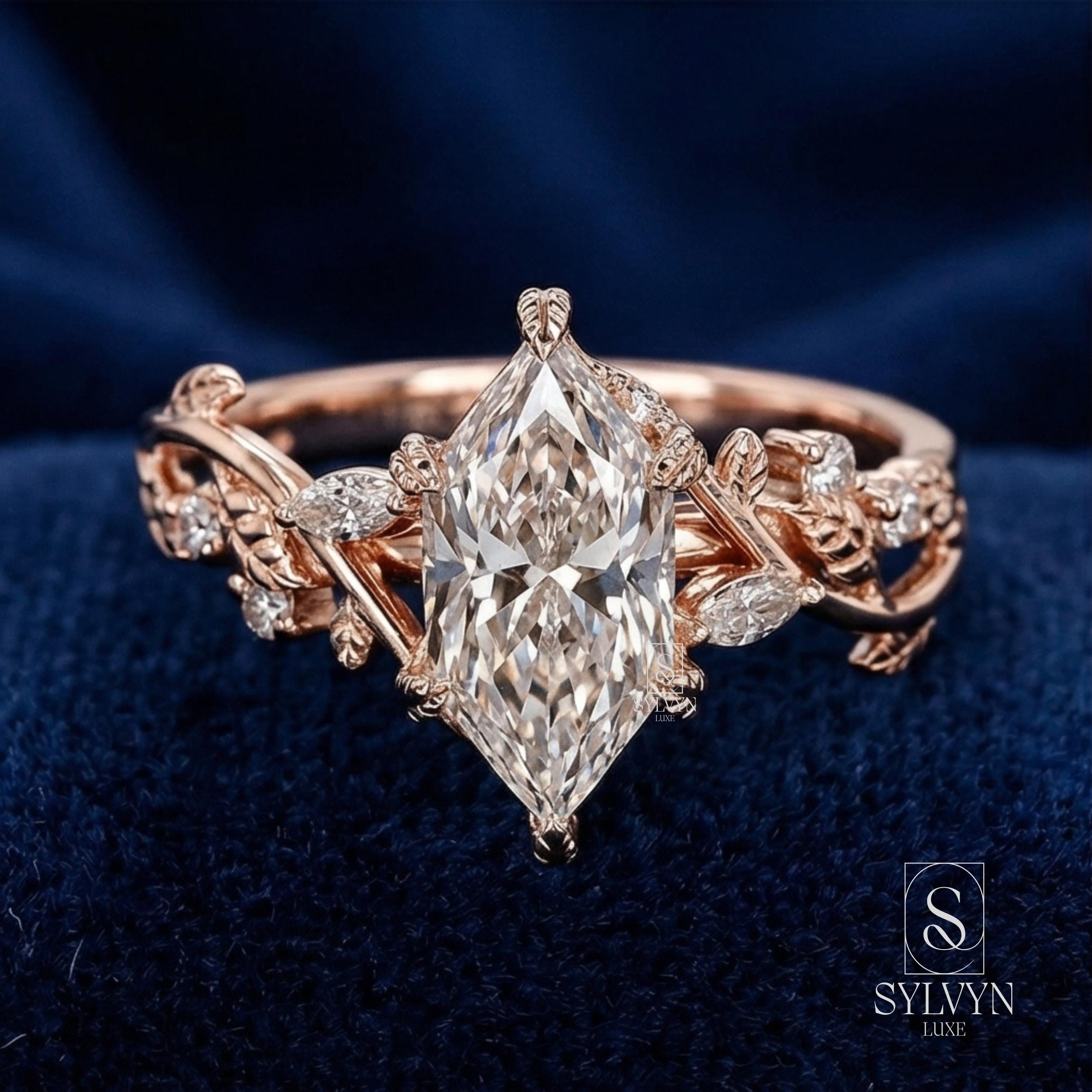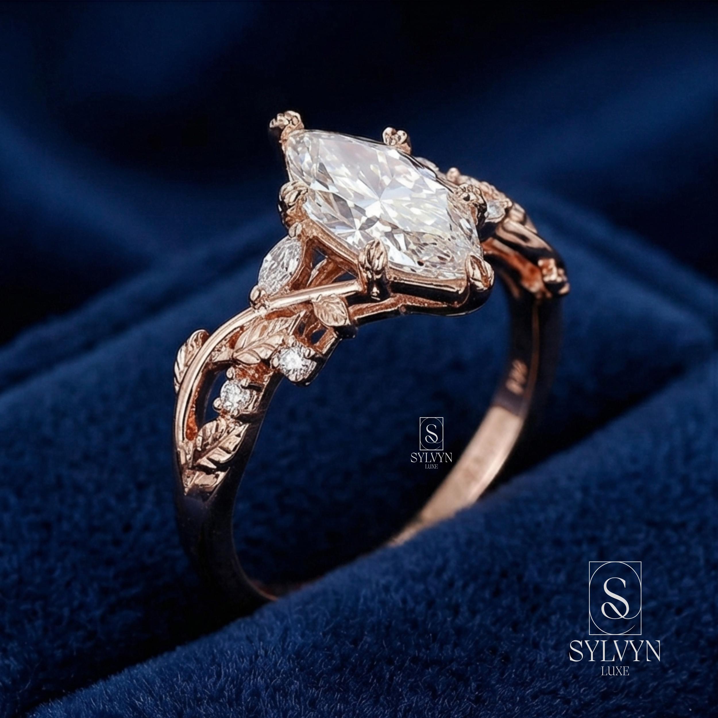 Marquise Cut Lab Grown Diamond Engagement Ring in Rose Gold | Vintage Floral Vine Ring with Leaf Details |Unique Nature Inspired Bridal Ring